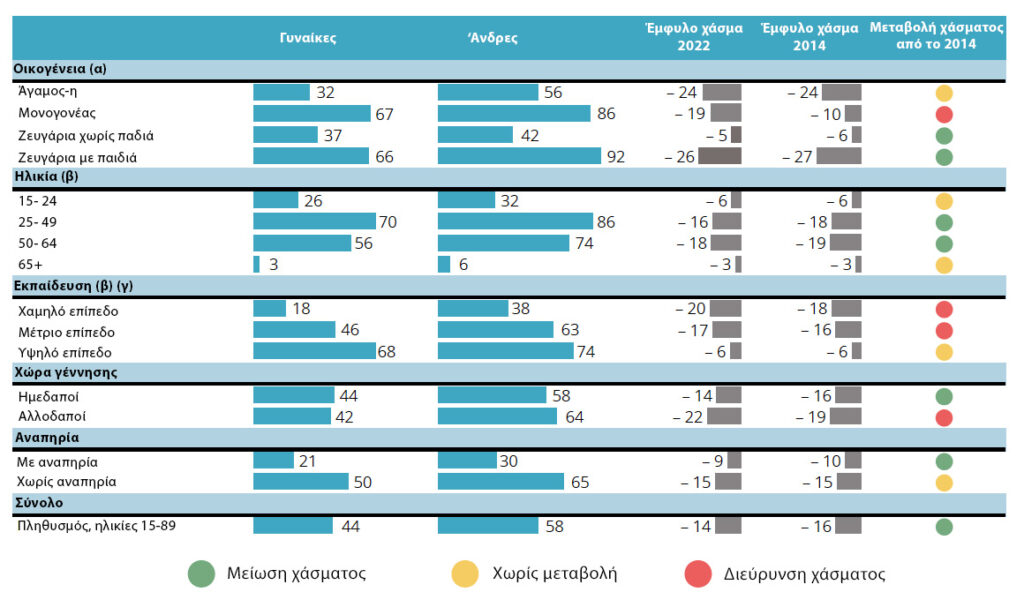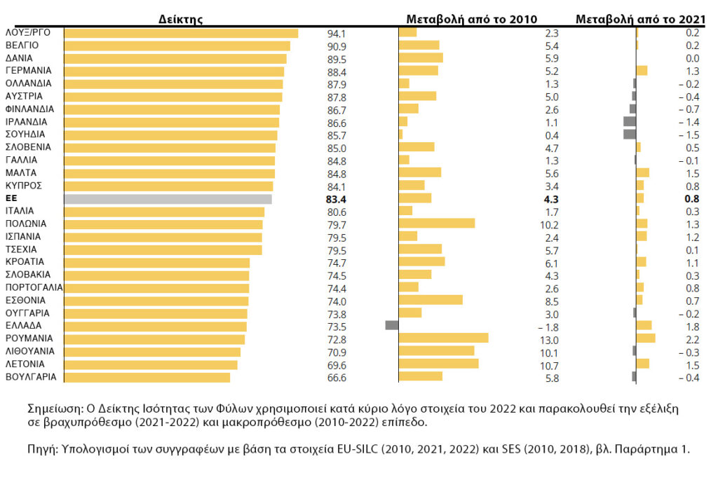 Η Ελλάδα βρίσκεται στους ουραγούς της Ευρώπης (4η από το τέλος) στον δείκτη ισότητας φύλου στην εργασία με 69,4 βαθμούς και μια μικρή βελτίωση μόλις κατά 0,7 μονάδες από το 2021 (Σχήμα 2). Ωστόσο στο ίδιο διάστημα επιδεινώθηκε (κατά 0,3) ο έμφυλος διαχωρισμός στην αγορά εργασίας αλλά και η ποιότητά της. Το δε χάσμα σε ισοδύναμο πλήρους απασχόλησης συνολικά ανάμεσα στα δύο φύλα έφτασε τις 20 μονάδες (36% οι γυναίκες και 56% οι άνδρες), το δεύτερο μεγαλύτερο στην Ε.Ε. Στα δε ζευγάρια με παιδιά αυτή η διαφορά άγγιξε τις 33 μονάδες.